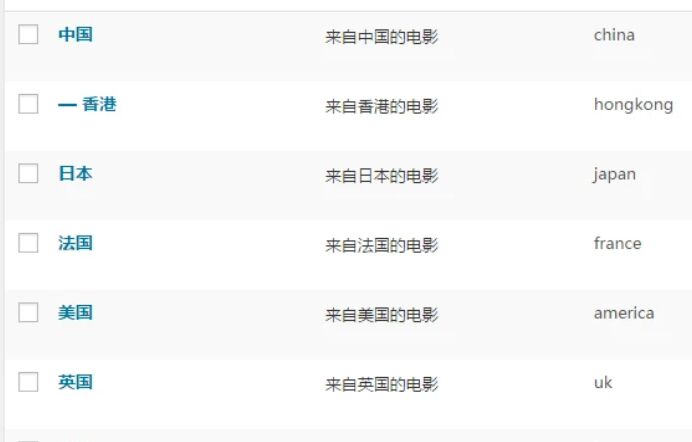 分类法的管理界面像 “分类” 还是 “标签” 取决于你的 hierarchical 参数,下边是我们创建的 “电影国家” 分类法。