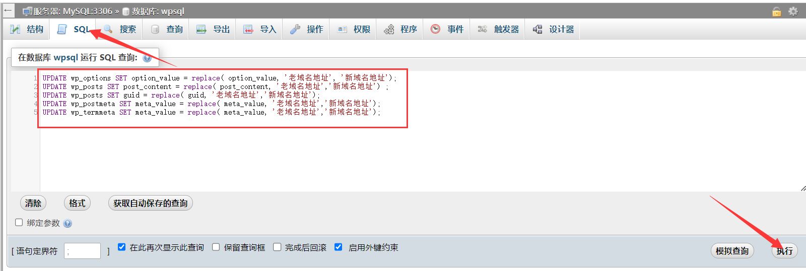 第六步:再点击数据库的SQL;使用以下的SQL语句,批量替换数据中的所有老域名;(以下语句中更换成自己的新旧域名)